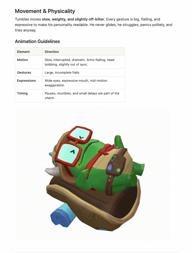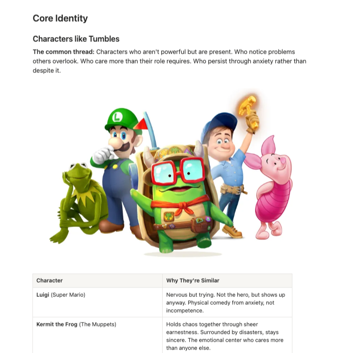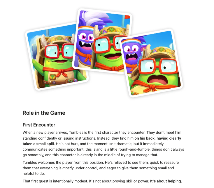 We built the playbook to answer that. Personality, voice, visual rules, do's and don'ts. Everything a team needs to put Tumbles into a game, a piece of content, or on a shelf and have him feel like himself every time.